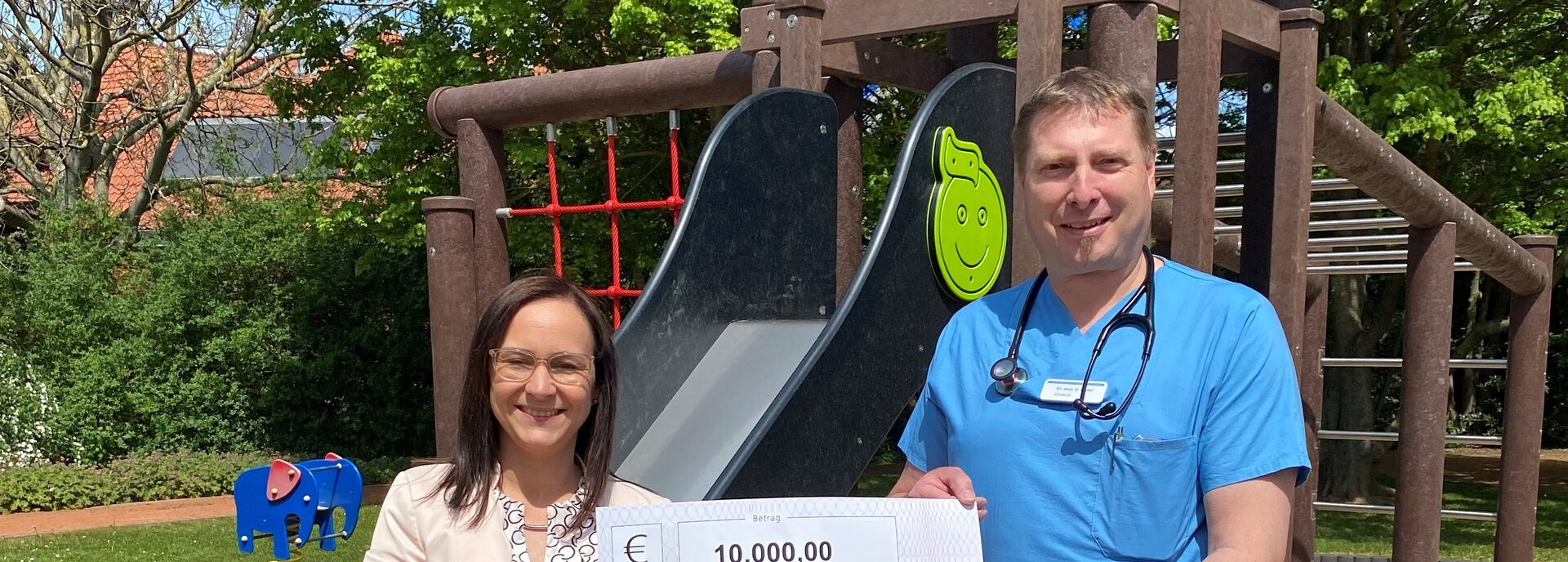 Sibylle Hildebrandt, Referentin für Presse- und Öffentlichkeitsarbeit der Kreissparkasse und Dr. med. Oliver Möller, Chefarzt der Kinder- und Jugendmedizin am Eichsfeld Klinikum bedanken sich bei allen Kunden der Kreissparkasse für ihre Teilnahme an der Aktion PS-Los-Sparen und ihrem Engagement, damit gemeinnützige Projekte und Einrichtungen im Landkreis Eichsfeld zu unterstützen.