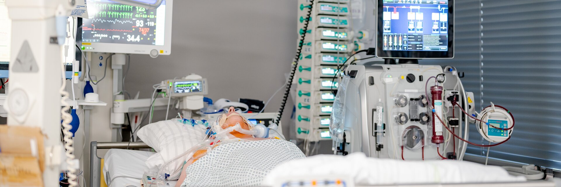 Nach einem täglich individuell für unsere Patient*innen erstellten Therapieplan werden verschiedene Maßnahmen umgesetzt. Dabei kann es sich um eine rein medikamentöse Unterstützung verschiedener Körperfunktionen handeln, aber auch um technische Organersatzverfahren wie z. B. Dialyse oder Beatmung.